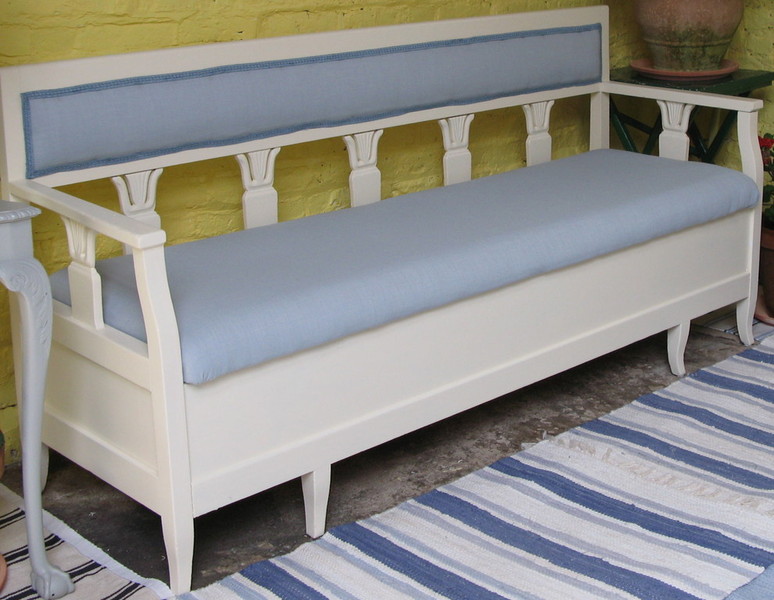 A charming and very useful painted Swedish rustic pine bench with bleached seating and under storage.