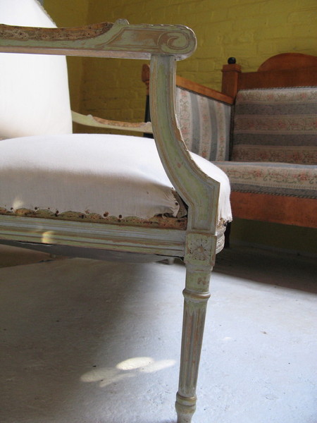 A well carved late 1800s Swedish 'salong' sofa in Louis XVI style. Scraped back to original paint.