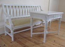Well carved decor in a blend of Gustavian and Art Nouveau style with later paint. A well proportioned and elegant Swedish bench and matching table.