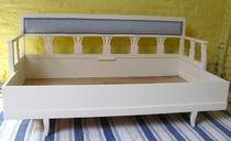 A 17/1800s Gustavian wooden sofa with carved decor and later paint. Upholstered seating and under storage.